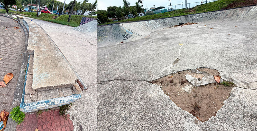 Durante fiscalização, o vereador C&A (Antônio Carlos Aprijo) mostrou equipamentos completamente inutilizados. O balanço está quebrado e precisa ser retirado para evitar acidentes. Um banco foi arrancado, deixando vergalhões expostos, que podem causar ferimentos graves. A pista de skate apresenta falhas no piso que travam as rodas e podem provocar quedas em adolescentes.